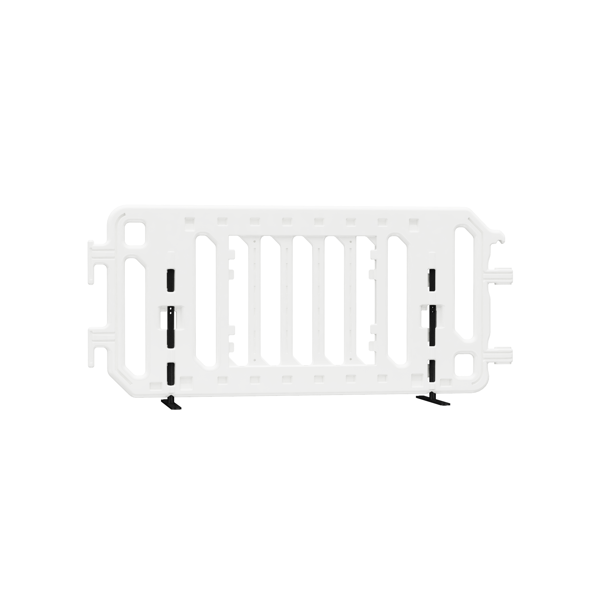 Extra durable thick walled plastic barricade with steel legs and feet. Flat steel anti-trip feet are securely welded to steel legs which are integrated into the panel preventing tip-over for large crowds. Features tamper resistant double locking hooks to create strong connections between panels. Quick-Change sign system makes it easy to insert signs.