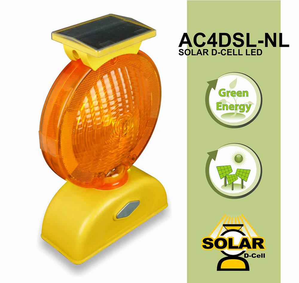 The AC4DSL-NL is a dual Solar/D-cell barricade light powered by an extremely efficient solar panel, D-cell batteries, or a combination of both. Combining power supplies provides longer operational life and greatly reduces the frequency of battery changes thus increasing worker safety and reducing battery disposal. During daylight hours the solar panel charges the batteries, even in overcast conditions.